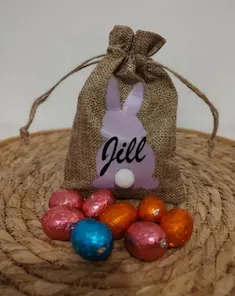 Paaszakje met Naam – Jute Look met Schattig Paashaasje